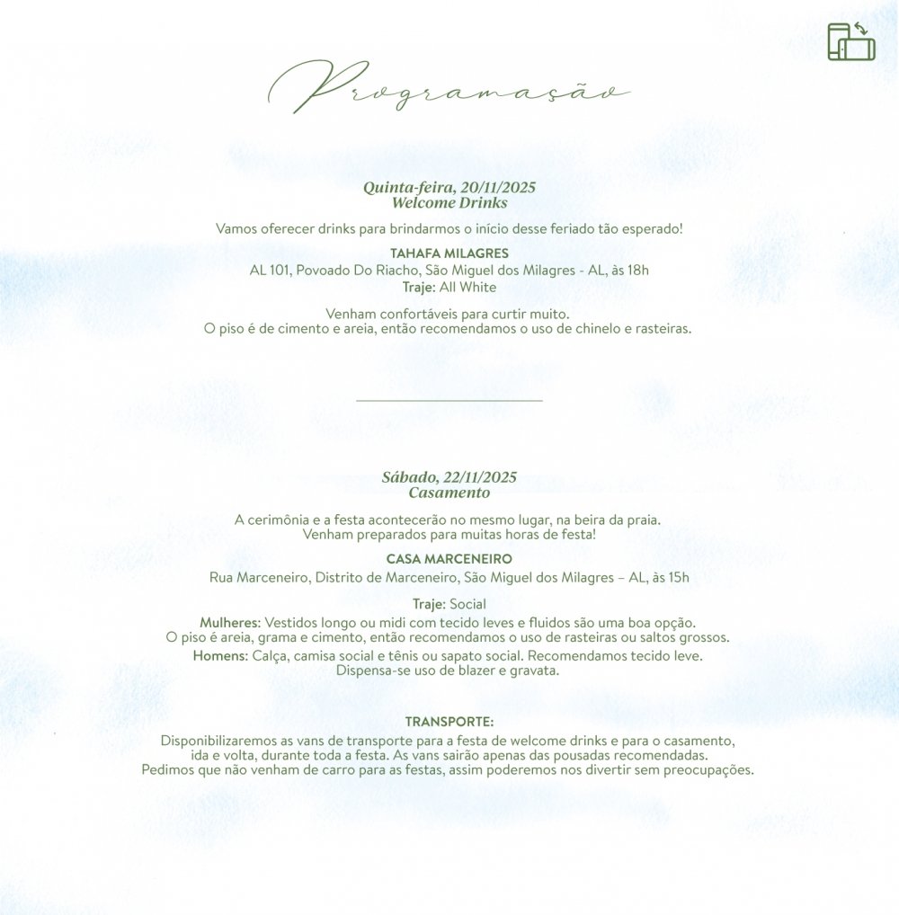 Além de amarmos o astral e a energia do Nordeste, queríamos muito celebrar o nosso casamento em uma grande festa interminável. Por isso, queremos convidar todos vocês para uma experiência inesquecível em Milagres.